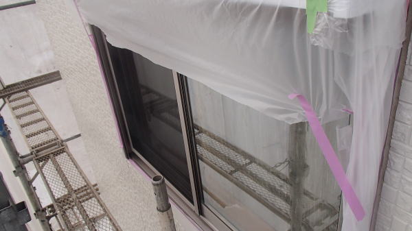 ベランダ内は天井と壁を同時に仕上げたので、掃き出し窓の養生を切らせていただきました